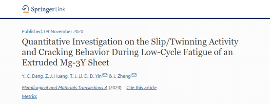 此研究提供了一种新颖有效的定量分析裂纹与变形模式之间的联系的方法,加深了变形机制与疲劳力学行为、断裂模式之间对应关系的理解,为稀土镁合金的疲劳提供了新见解,定量和统计性的滑移/孪生激活规律和裂纹模式也将为镁合金疲劳的建模和模拟提供有价值的数据基础。相关工作以“Quantitative Investigation on the Slip/Twinning Activity and Cracking Behavior During Low-Cycle Fatigue of an Extruded Mg-3Y Sheet”为题发表在金属材料领域的著名期刊Metallurgical and Materials Transactions A,中科院2区。论文合作者有重庆大学李天骄硕士,重庆大学郑江教授(共同通讯)。