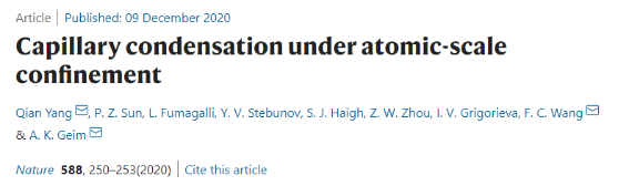 12月10日出版的国际顶级学术期刊《Nature》发表了我院博士毕业生杨倩(现为英国曼彻斯特大学博士后)为第一作者的文章Capillary condensation under atomic-scale confinement (Nature, 2020, 588, 250–253 , //doi.org/10.1038/s41586-020-2978-1),报道了纳米限域毛细凝聚新理论,并对传统开尔文公式进行了修正,使其能够更好地描述亚纳米尺度的毛细凝聚现象,为解开毛细凝聚这一百年谜题提供了方案。材料科学与工程学院(材料先进技术教育部重点实验室)教授、前沿科学技术研究院院长周祚万博士为该文章的共同作者。