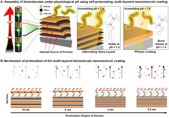 近日,西南交通大学涂秋芬副教授利用等离子交替沉积技术,构建了一个具有高表面正电荷密度的自质子化纳米涂层,用肝素作为模型治疗分子,以期实现负电性生物分子在材料表面的长期稳定负载并最大限度的保留其生物活性。在这项设计中,为了有效提高负电性功能分子的负载强度,在基底材料表面交替沉积纳米尺度的质子供体等离子聚丙烯酸和质子受体等离子聚烯丙胺。具体地,作者探索了不同厚度交替层对最终表面正电荷密度的影响,最后通过静电作用实现了对模型活性分子肝素的负载。相比于单一的相同厚度的等离子聚烯丙胺涂层,实现了肝素的更高、更持久、耐受生理环境和活性保持的非共价负载。
