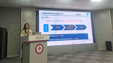资产与实验室管理处实验室安全科赵春花对我校实验室安全管理的工作要求和相关管理办法等进行了解读,传达了国家对安全生产工作的要求,要求树立生命至上、安全第一的发展理念,教育部等部门也于近几年密集发布了众多关于高校实验室安全工作的相关文件。这些文件必须要层层落实责任,才有可能将工作有力的开展下去。我校实验室安全管理工作按照“统一领导、分级负责、责任到人”模式开展,采用学校、二级教学科研单位、实验室三级管理方式,其中学校主要承担安全监管责任,后两者承担安全主体责任,每年学校会与各二级单位签订实验室安全责任书。