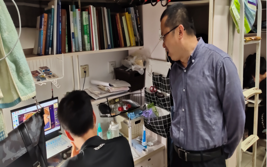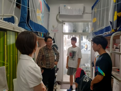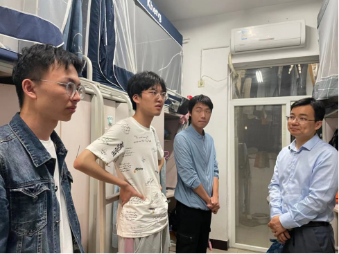 (2021年6月9日,楼长朱旻昊走访卓越班宿舍进行安全检查,与学生交流学业和日常生活情况。)