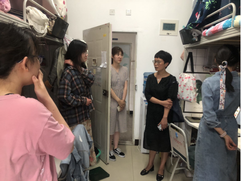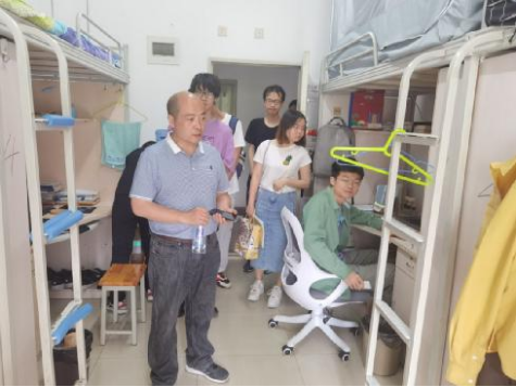 (2021年5月20日,楼长屈树新深入本科生2018级女生宿舍进行安全检查,关心同学们的日常学习与生活。)