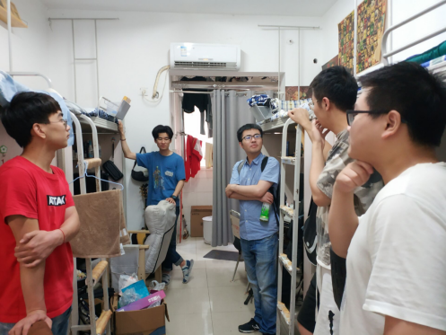 (2021年5月2日,楼长陈勇、章春军、李涛带领本研辅导员分别排查本科生宿舍、研究生宿舍及工位存在的安全隐患。)