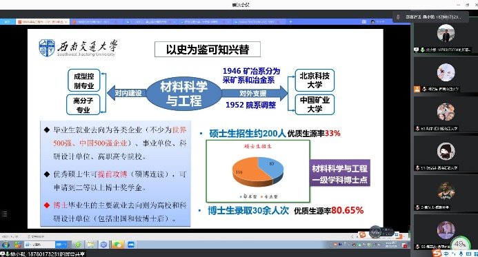 生物医学工程系、金属材料系、材料加工系、高分子材料系的相关情况,为同学们做了详细介绍。随后,围绕同学们关心的问题,师生们进行了深入的交流。