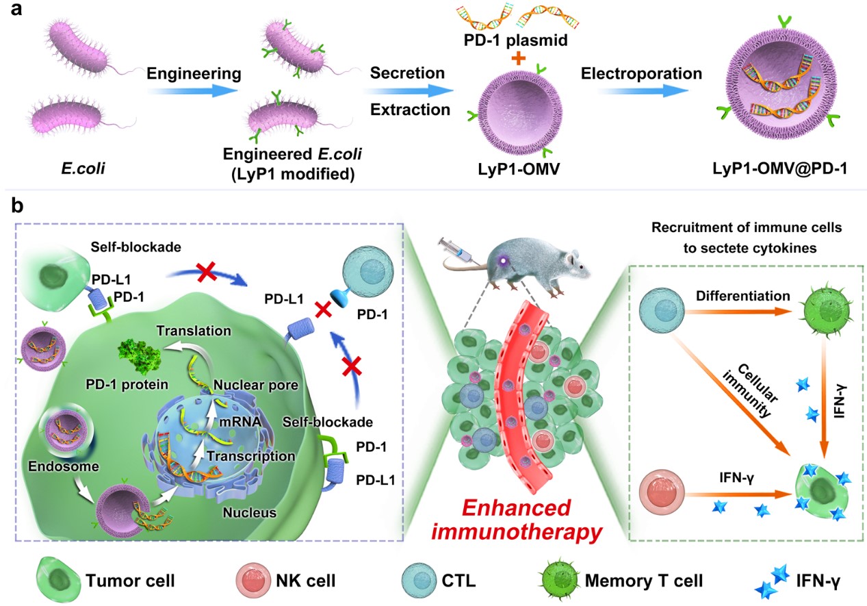 近日,西南交通大学周绍兵教授团队博士研究生潘敬梅历经3年时间制备了一种负载PD-1质粒的LyP1多肽修饰的细菌外膜囊泡,以实现对肿瘤细胞PD-L1的自我阻断。纳米载体通过细菌外膜囊泡的靶向能力在肿瘤组织中聚集,并通过LyP1介导的靶向内化到肿瘤细胞内,随后将PD-1质粒送入细胞核,使肿瘤细胞表达PD-1(图1)。另外我们开发了一种用于定量检测PD-1/PD-L1结合量的磁微粒化学发光试剂盒,自身表达的PD-1与自体和邻近肿瘤细胞表达的PD-L1结合,实现了自我阻断。因此,它可以重新激活细胞毒性淋巴细胞(CTL),以根除癌细胞。同时,该纳米载体成分的外膜蛋白可将CTL和自然杀伤细胞(NK)募集到肿瘤组织中,刺激其分泌干扰素-γ,进一步提高PD-1/PD-L1自身封闭治疗的抗肿瘤活性。该策略对4T1,CT26,B16这三种肿瘤模型均表现出优异的抑瘤效果,并且纳米载体对4T1和B16肿瘤的阻断率分别为94.7%和96.7%,分别是PD-L1单克隆抗体的1.90倍和9.04倍。因此,这种简单安全的策略为肿瘤免疫治疗纳米药物的开发铺平了道路。