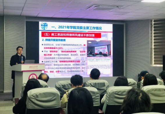 之后,朱旻昊院长作了学院工作报告和个人年度述职。朱院长系统地从学科专业建设、人才培养、科学研究、实验室工作、学生工作等方面向与会人员汇报了学院2021年整体工作情况,强调要凝练教学特色培育教学成果,提出应提供更多师生交流平台,加强全员育人深度,重视学生心理安全工作的开展。而后,朱院长从政治思想、廉洁自律、行政工作、问题与改进四方面进行了个人年度述职。