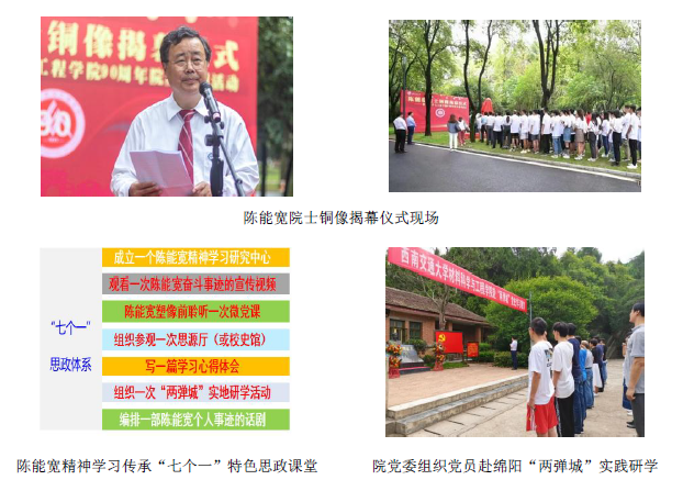 赓续校友红色资源,打造特色思政课堂。启动陈能宽精神学习传承行动计划,陈能宽雕塑落地校园,打造“观看1次宣传视频、塑像前聆听1次微党课、撰写1篇学习心得体会、组织1次‘两弹城’实地研学”的“四个一”思政课体系,组建陈能宽精神宣讲团,录制微党课2次。将学习体系纳入研究生积极分子、党员的日常培养教育,推动特色思政课堂建设。