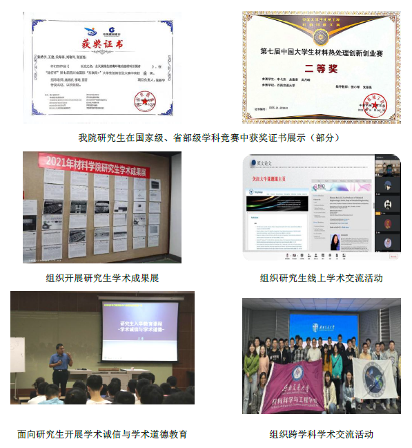 制定研究生学术文化营造及学术诚信教育工作方案,有序推进系列活动开展。2021年,全年立项研究生学术素养提升计划集体专项项目4项,其中被评为“优秀建设案例”结项的为2项,占比全校全年优秀建设案例20%。举办第一届先进材料研究进展博士论坛活动,涵盖生物医用支架,生物与诊疗,医用多功能材料,金属功能材料,高分子及能源材料,水凝胶材料六个分会场,包括先进材料研究前沿的36个方向。在学院官网及官方公众号报道高水平论文成果,以宣传工作促进学术氛围营造;组织校内外专家学者交流活动6场,开展研究生学术道德教育、学术诚信教育活动20余场;鼓励支持研究生参与各类学术论坛、行业年会,对国际前沿学术有亲身经历和实际体会,帮助学生提高自身学术水平,了解所在专业领域的前沿学术成果。学院研究生积极参加各类竞赛,获得国家级、省部级奖励10余项;2021年学生累计发表高水平SCI学术论文93篇,授权专利70余项;注重榜样力量,宣传研究生“竢实扬华奖章”获得者严涵同学,鼓励国家奖学金获得者分享交流经验,发挥朋辈引导作用。
