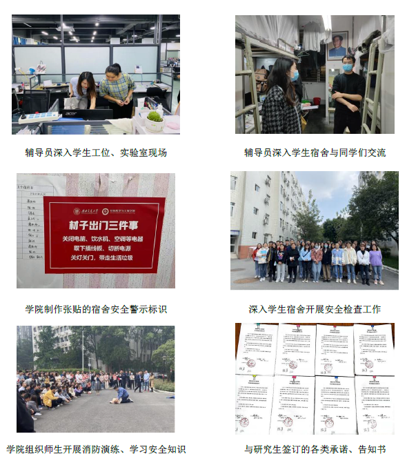 深入学生实验室、工位,深入学生宿舍、深入学生社会生活与社交网络,加强与学生的沟通交流。构建“教育与培训、检查与整改、警示与提醒、告知与承诺、演练、奖惩、简报”的“七位一体”安全保障机制,组织安全教育16次,安全检查40余次。组织签订含实验室安全、诚信考试、宿舍安全、防范电信诈骗、疫情防控等各类承诺书;做好安全整改,各类专题教育覆盖全员。紧密联系校外住宿学生,组建校外住宿学生群,关注非园区住宿研究生日常安全。开展与研究生导师的定期交流,做好安稳信息周研判报送等制度,并推行安全月报。强化防疫思政课堂教育,严肃防疫规矩与纪律,全员签订防疫要求告知书,疫苗接种、核酸检测100%完成。重视心理测评与结果应用,通过谈心谈话、帮扶疏导等方式,对重点支持学生全方位关心关爱。