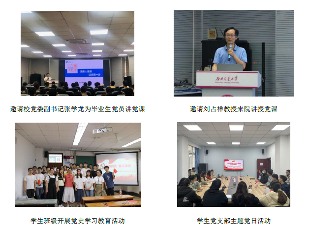 重视总体谋划与推进,制订实施方案,成立工作组,做好顶层设计与动员部署,明晰“六个结合”、“十大任务”,分阶段推进党史学习教育。用好全方位、多角度的学习方式,重视讲学引学与指导,培养学生自主学习意识。邀请校党委张学龙副书记、马克思主义学院刘占祥教授等专家教授为研究生党员讲授党史学习教育专题党课;组织集体研学研讨10余次,组织学生支部主题党日活30余项;立项校级“示范性学生党支部特色活动”3项,获评校级“优秀党日活动案例”1项,研究生第十二党支部成功入选西南交通大学第二批研究生党建“头雁计划”。做好自查自纠,主动发现问题、做好整改,确保每个党支部、每名党员完成学习教育规定动作,逐一通过验收。