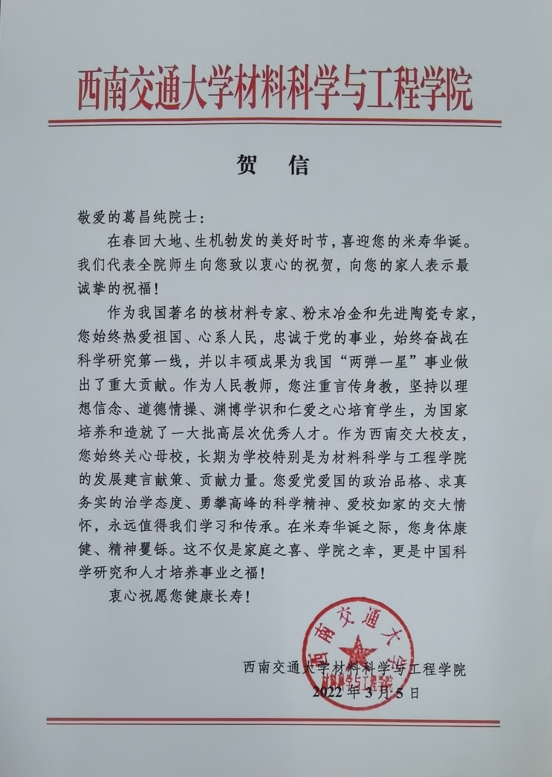 2022年3月6日,中国科学院院士、大发体育 杰出校友、双聘院士葛昌纯教授迎来88岁米寿华诞。近日,学院给葛昌纯院士呈送贺信,向他致以衷心的祝贺。