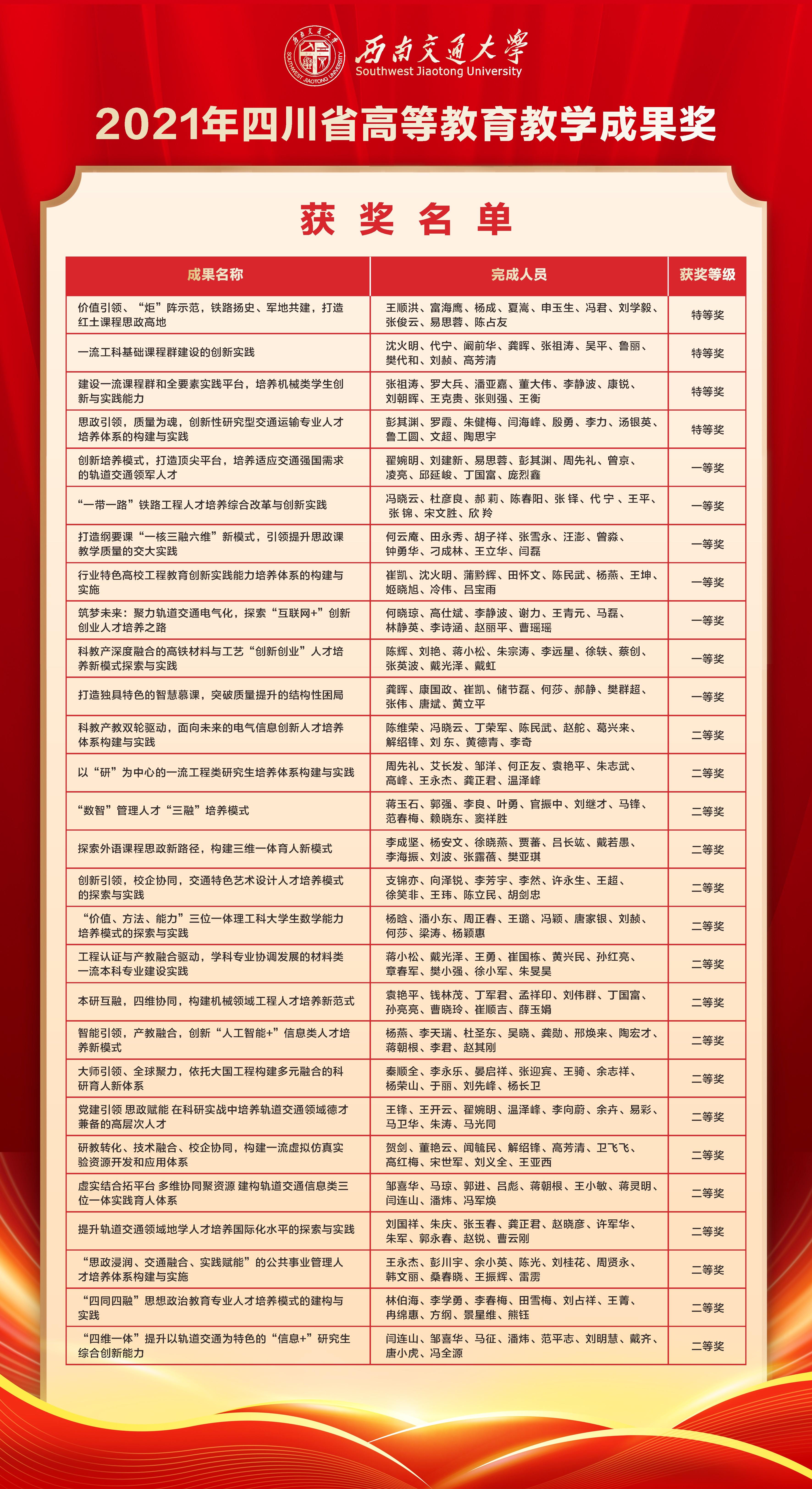 据悉,我校在本届四川省高等教育教学成果奖评选中取得佳绩,获得特等奖4项、一等奖7项、二等奖17项。