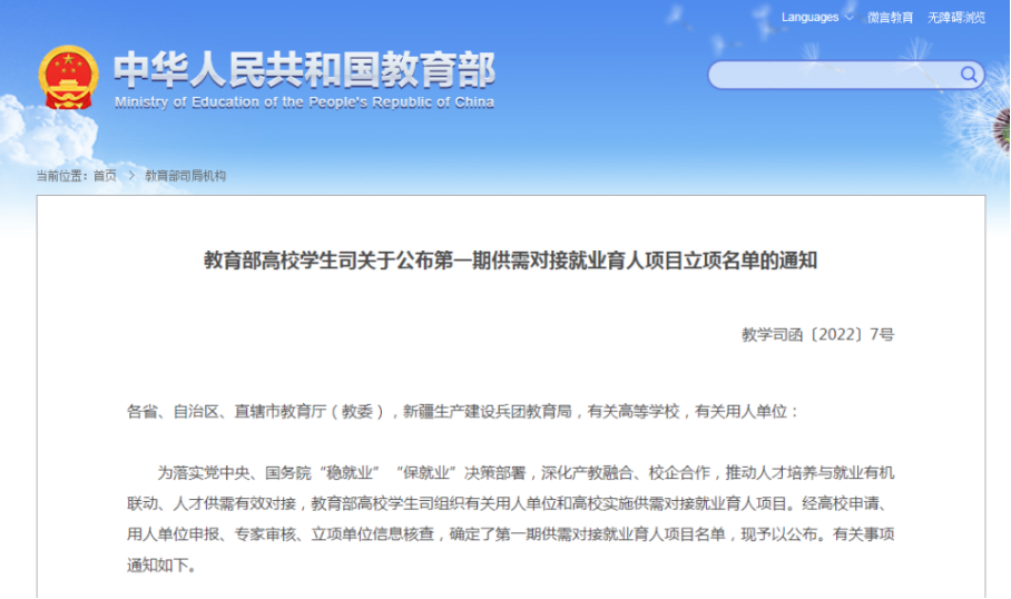 近日,《教育部高校学生司关于公布第一期供需对接就业育人项目立项名单的通知》(教学司函〔2022〕7号)正式发布,大发体育
