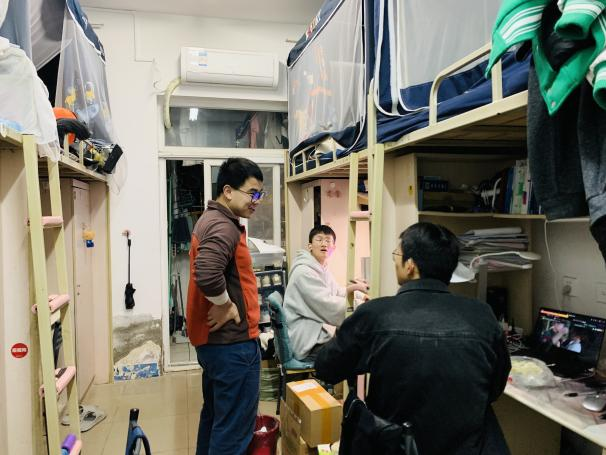 20:00,2018级毕业班辅导员梁喻嘉、黄德明一起到达天佑斋17栋看看即将毕业的同学们,这已经两位辅导员老师本学期第21次前往学生宿舍,针对学生考研复试调剂、就业签约、宿舍安全等工作,开展一对一指导帮扶。梁老师在确定被录取为研究生的人数达到150人,较去年增长超过15人、比例将至少提升4%后,激动地在朋友圈记录2018级同学们的收获。
