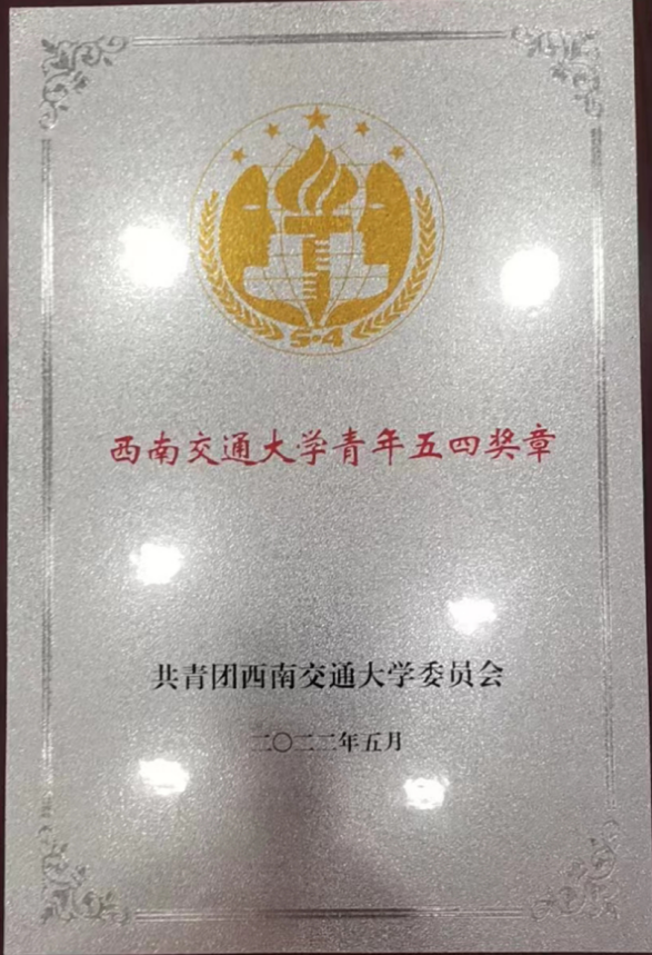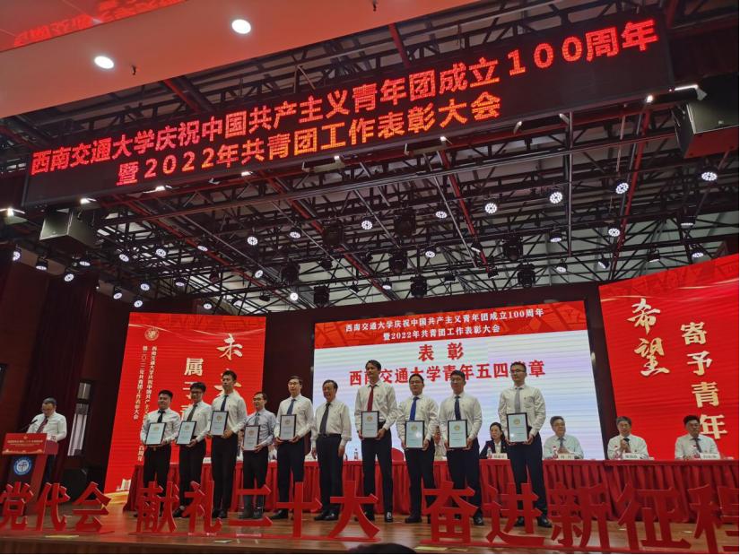 西南交通大学五四奖章是共青团西南交通大学委员会授予优秀青年的最高荣誉,旨在树立政治进步、品德高尚、贡献突出的优秀青年典型,反映当代青年的精神品格和价值追求。在五四青年节即将到来之际,为表彰先进,选树典型,激励全校广大青年奋发有为,2022年4月29日下午,西南交通大学以“喜迎党代会、献礼二十大、奋进新征程”为主题举办庆祝中国共产主义青年团成立100周年暨2022年共青团工作表彰大会。