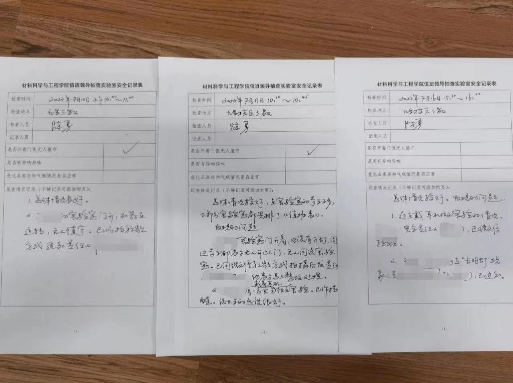 值班领导抽查实验室安全记录表》和《暑期安全巡查记录本》。