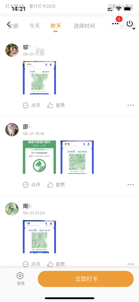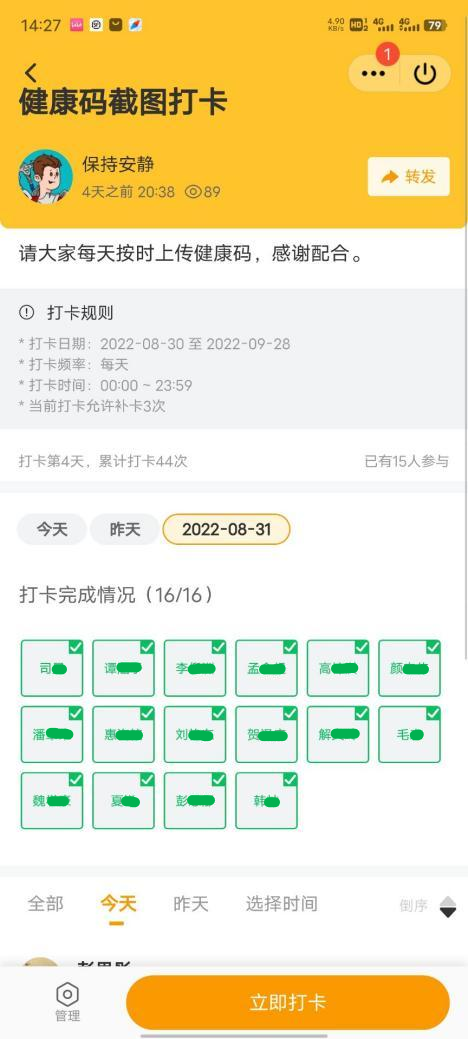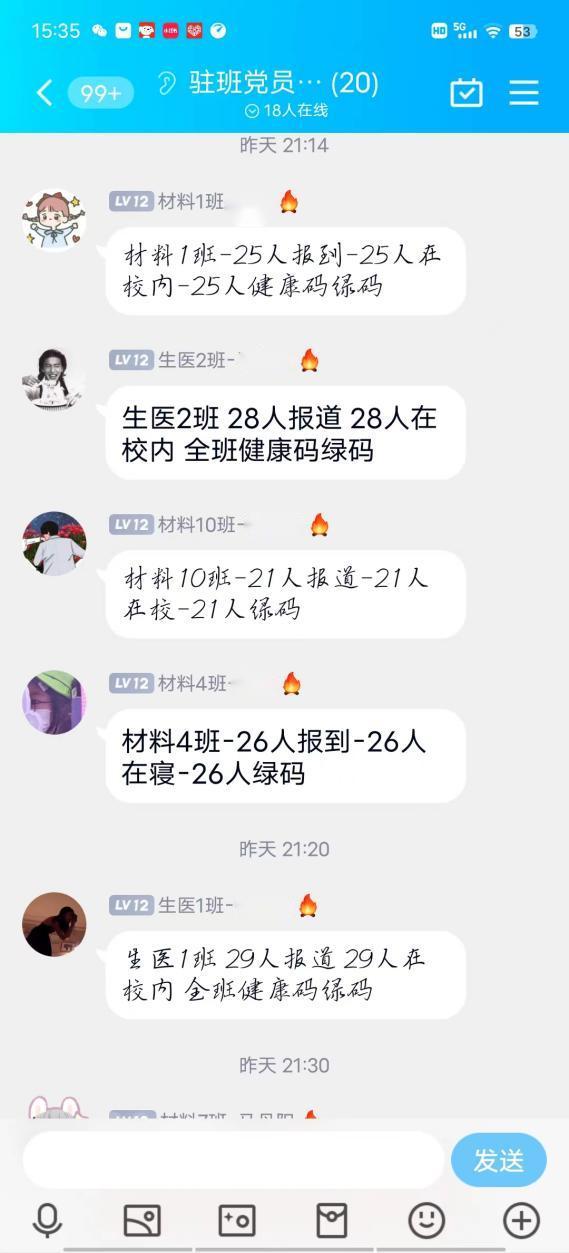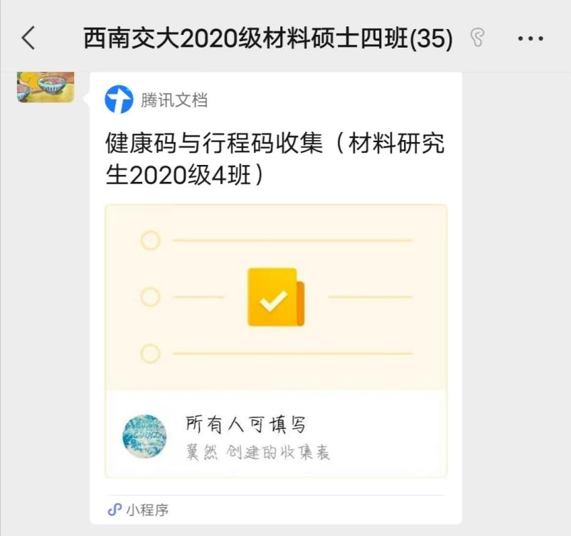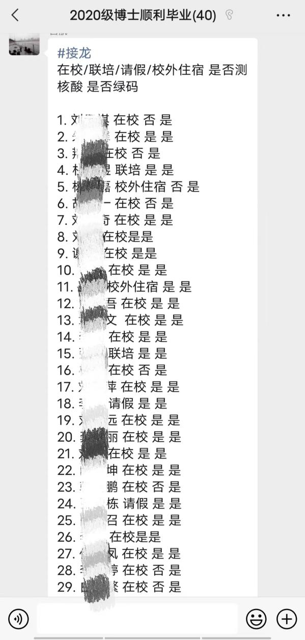 本、硕、博全部年级采用多种形式,每日在各自班级群中收集在校同学健康码及参与核酸检测情况。本2020级动员班级组织委员,每日在群中提醒返校同学上传健康码并整合在Word中进行留底统计。本2021级使用线上小程序“接龙管家”,学生上传健康码并打卡,可以随时了解到同学们的核酸检测情况,实时更新在校同学人数。本科2022级驻班党员同志主动担当,负责班级健康码及核酸检测结果的及时汇报。