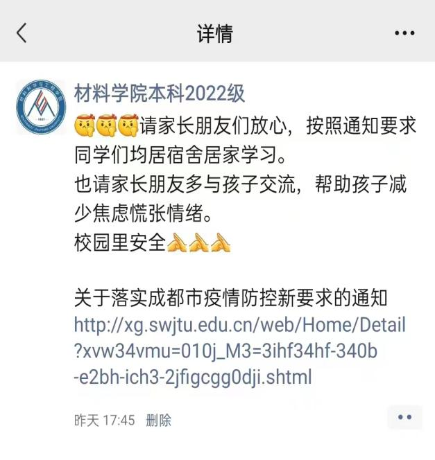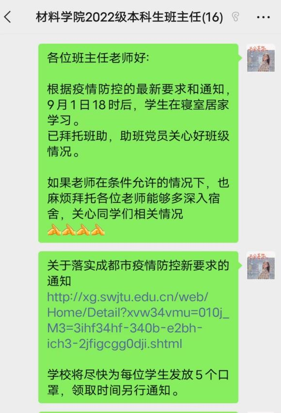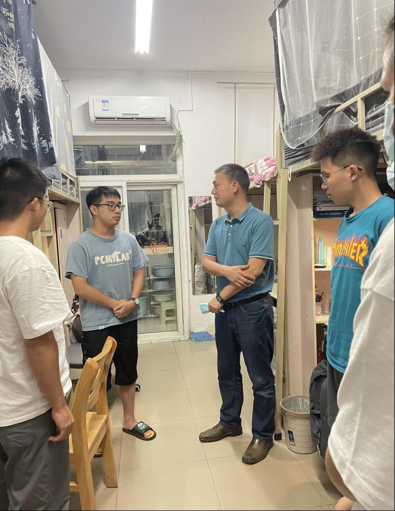 2022级辅导员动员召集班助及驻班党员深入学生宿舍,为新生同学分发口罩,关心新同学新环境适应情况,鼓励大家同心协力,一起抗击疫情;同时通过年级微信,向家长汇报同学们在校情况,请家长放心;叮嘱家长朋友们多与同学们沟通,减少同学们的焦虑情绪;除此之外,2022级还鼓励、邀请新生班主任在条件允许的情况下多深入宿舍,深入同学。除了关心关爱每一位在校的学生,学院还牵挂着其他校外住宿学生,为他们带去温暖与关怀,特别是校外集中隔离的同学们,叮嘱学生疫情期间注意做好个人防护措施和每日健康打卡。2019级辅导员鼓励考研学子保持良好心态,共克时艰,积极备战考研。研究生辅导员开展了全覆盖的宿舍走访,并叮嘱同学及时带走实验区、工位贵重物品,合理安排学习计划,近期积极配合防疫要求,不去往实验室、工位,不往人员密集处聚集。