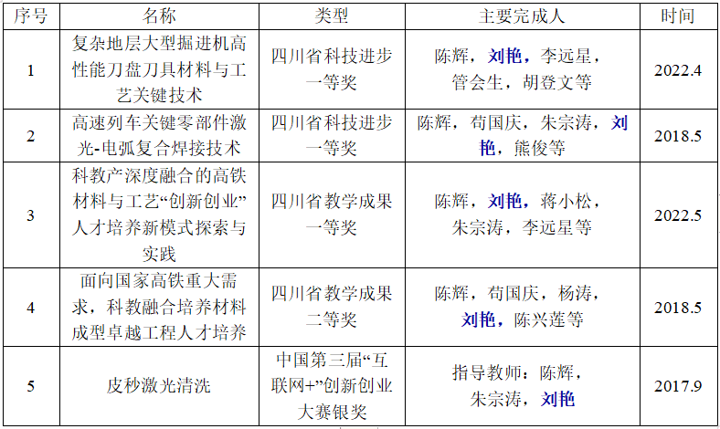 在教学研究改革方面,刘艳积极探索新的教学方法和教学模式,获得四川省高等教育教学成果一等奖1项(排名第2)、二等奖1项(排名第4)、西南交通大学教学成果一等奖1项(排名第3)(2020)。