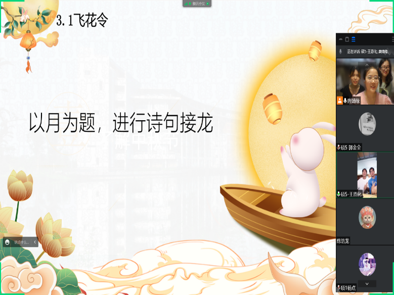 同学一起进行了“猜灯谜”和“拆拼图猜人名”的游戏活动,营造了愉快欢乐的节日氛围。“灯谜”还专门设置了和专业知识相关的小问题;“拆拼图猜人名”环节,不仅有战“疫”英雄,还有游戏名人、网络名人和学院的老师们。线上主题班会让师生们相聚云端,其乐融融,度过了一个有意义、有意思的中秋节。