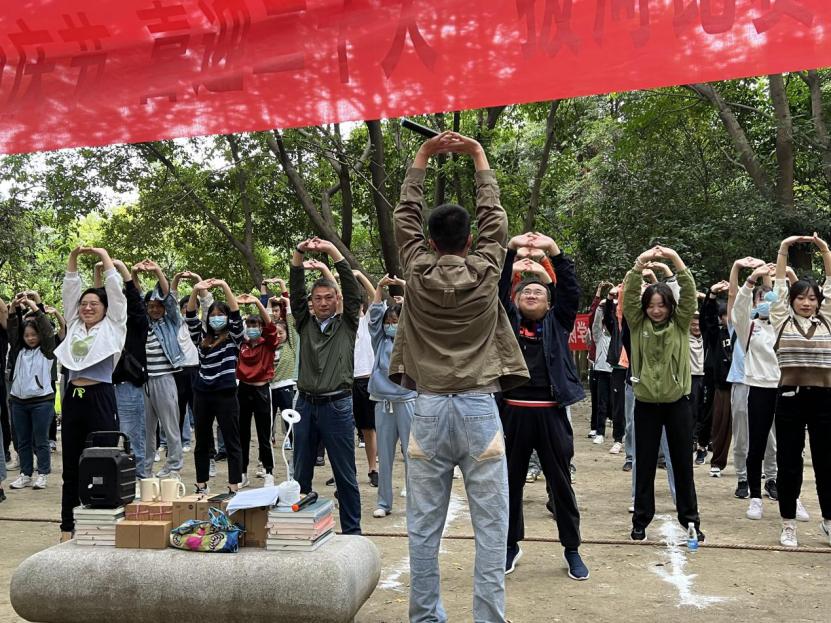 为了防止同学们在比赛中受伤,在比赛开始之前研会的工作人员带领老师和同学们进行了热身运动,为后面激烈的拔河比赛做好充足的准备。