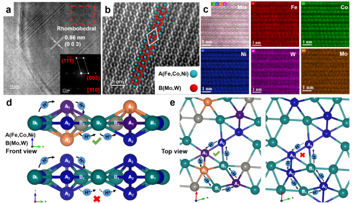 西南交通大学徐轶团队结合元素的类比性和结构的特殊性,并通过混合熵将两者联系起来设计了一种具有吸附-解吸自循环结构的非贵金属高熵合金纳米催化剂。在FeCoNiMoW HEA的FCC基体中,析出了大量具有斜方体结构的高熵纳米颗粒(HEA NPs)。通过组合和优化五种金属元素,实现了M-H键的强度和析氢自由能的最佳匹配。进而设计了一个具有原子自循环"生态系统"的HEA纳米结构。调整了FeCoNiWMo HEA NPs中的Co/Mo元素比例,证实了有序结构HEA NPs的含量与析氢性能呈线性关系。此外,球差透射电子显微镜(TEM)观测和密度泛函理论(DFT)计算详细揭示了其优异的性能归功于斜方体晶体结构和由金属原子选择性替代组成的自循环"生态系统"。在HER中,催化剂在碱性和酸性条件下电流密度为10 mA·cm-2的过电位分别只有35 mV和81 mV,而且该催化剂在工作48小时后仍具有良好的稳定性。更具吸引力的是,FeCoNiWMo HEA催化剂的成本仅为商业Pt/C电极的0.04%。