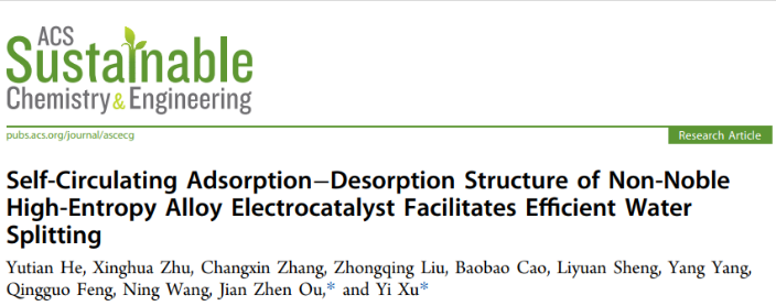 金属材料系徐轶团队围绕高熵合金的结构功能一体化,在水制氢领域取得重要研究进展。在由国际权威科研机构美国化学学会(American Chemical Society,ACS)创办的工程技术领域权威期刊ACS Sustainable Chemistry&Engineering (Top期刊,IF=9.224,一区)发表题为“Self-Circulating Adsorption-Desorption Structure of Non-Noble High-Entropy Alloy Electrocatalyst Facilitates Efficient Water Splitting”,该论文的第一作者为2021级硕士研究生何雨田,2021级博士研究生朱星桦,论文通讯作者为西南交通大学徐轶副教授和皇家墨尔本理工大学欧建臻教授。
