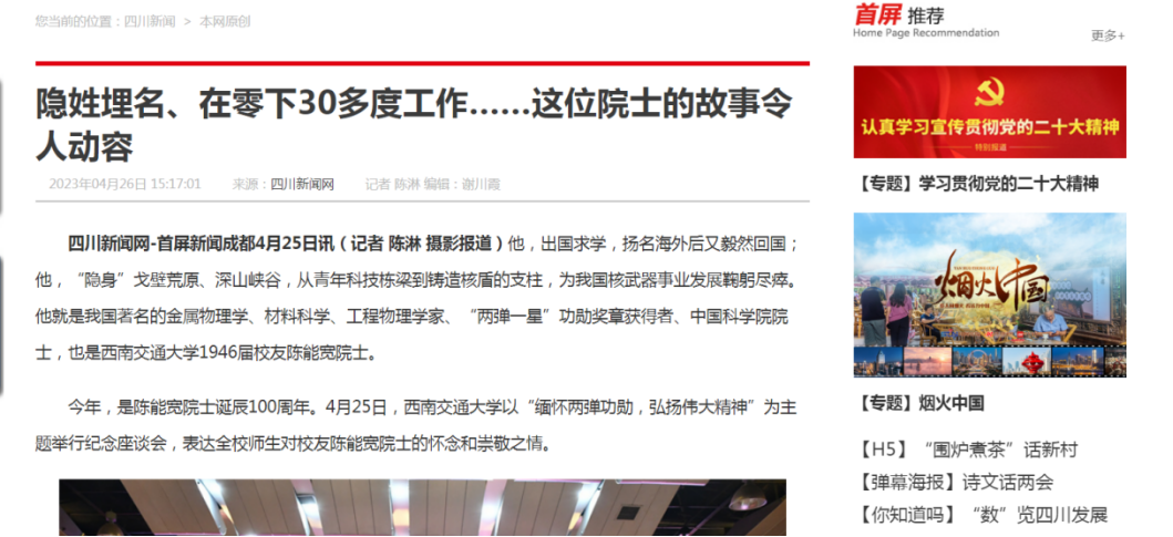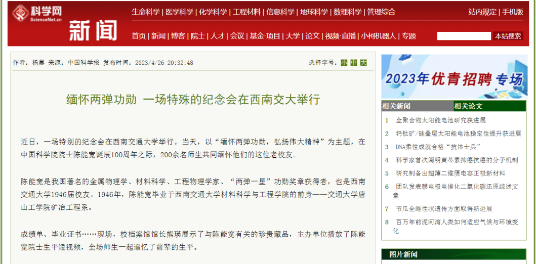 科学网:缅怀两弹功勋 一场特殊的纪念会在西南交大举行//news.sciencenet.cn/htmlnews/2023/4/499468.shtm