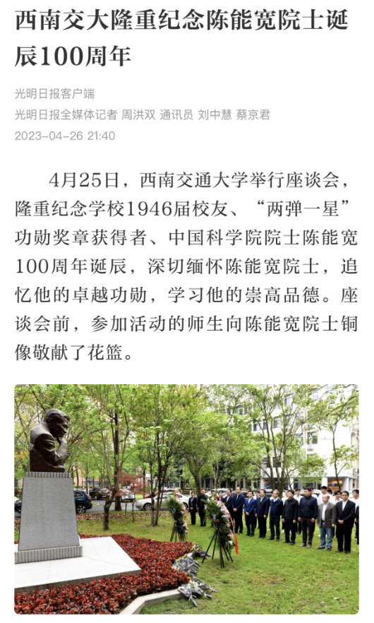 缅怀两弹功勋,弘扬伟大精神。近日,西南交通大学纪念陈能宽院士诞辰100周年座谈会在九里校区隆重举行。光明日报客户端、中国网、科学网、四川新闻网、红星新闻等多家校外媒体报道了本次活动。