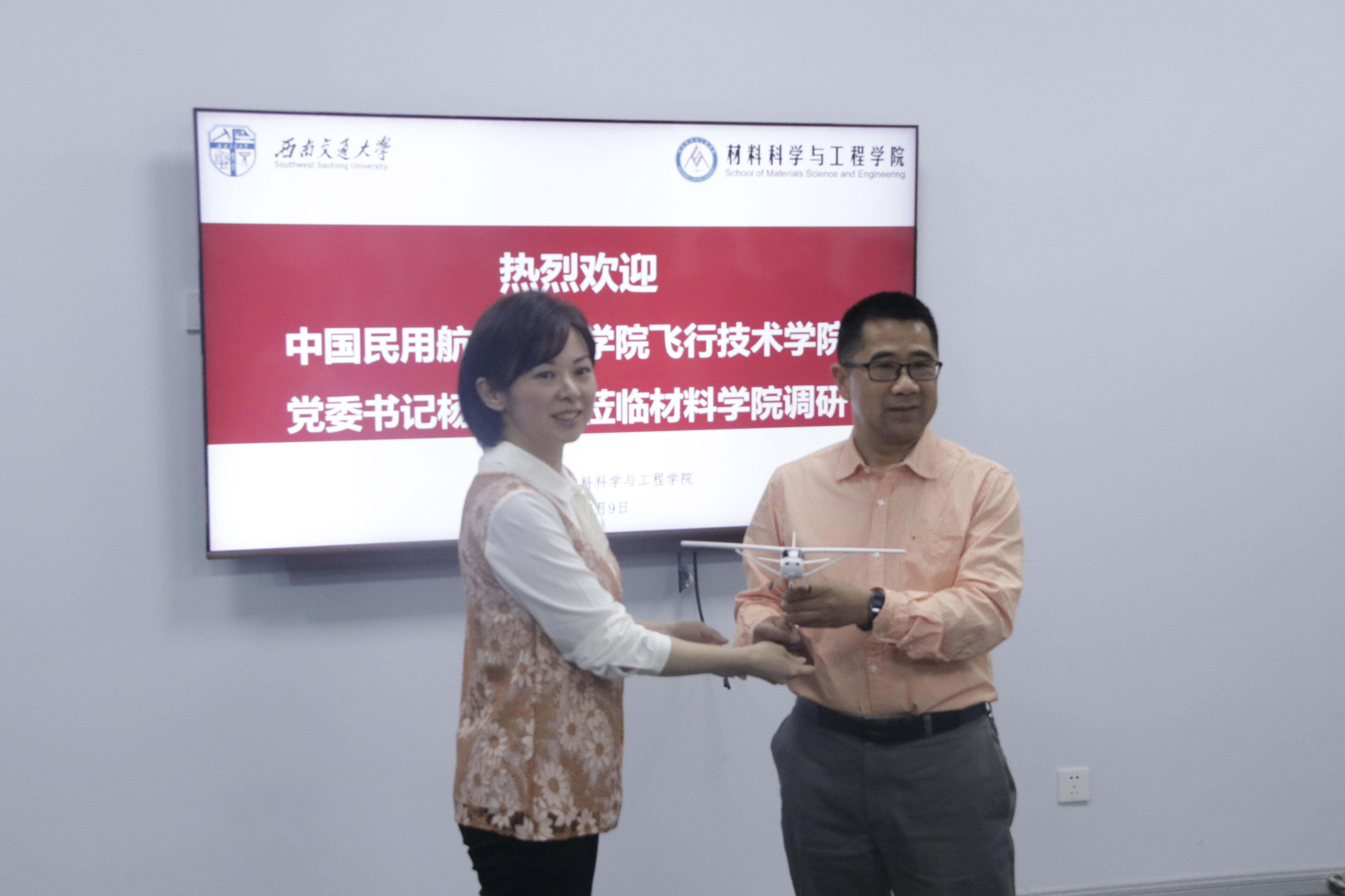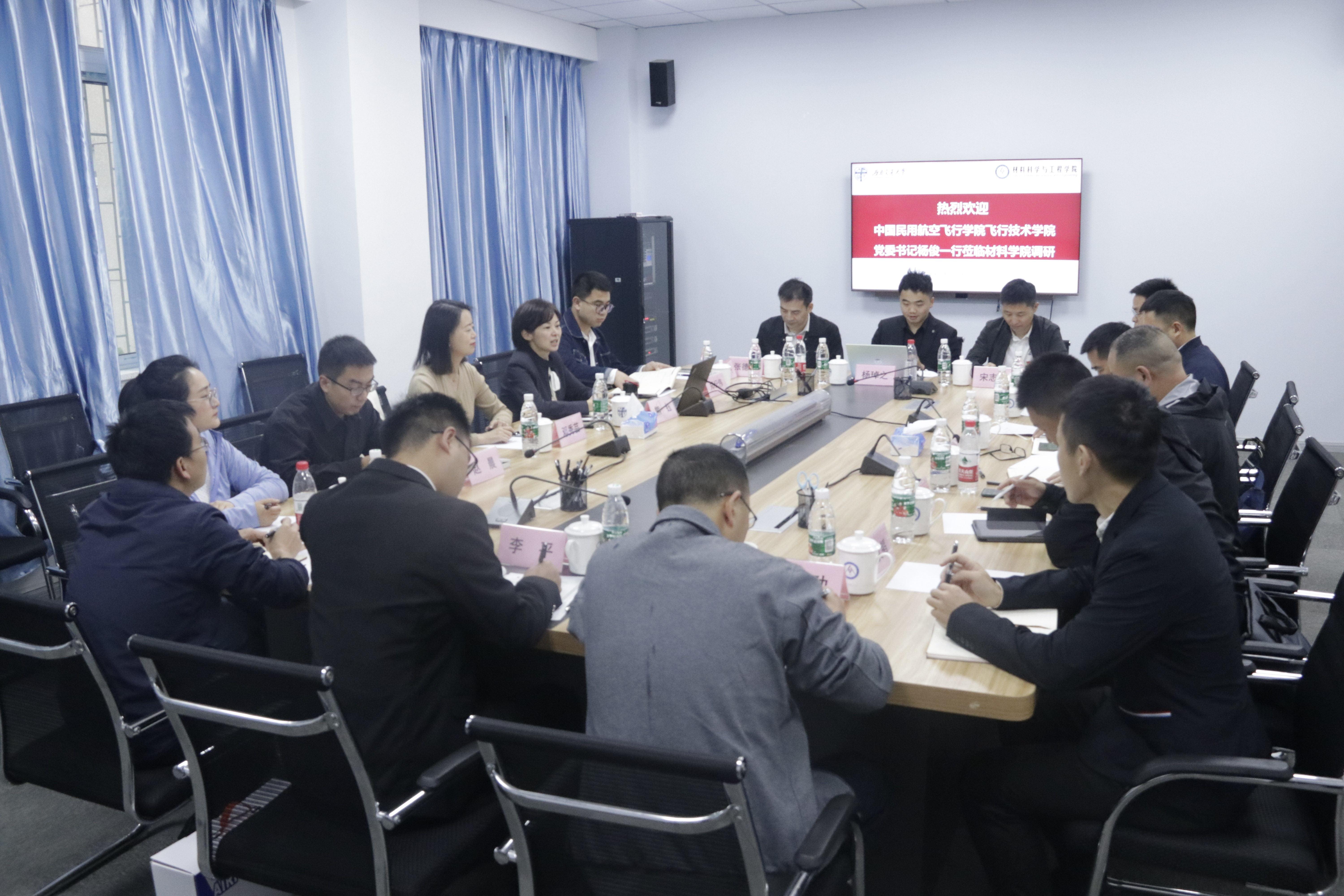 、历史沿革、学科建设、学生管理、辅导员名师工作室建设情况各自展开介绍。熊钰表示,飞行技术学院各项工作的先进经验和成功做法值得学习和借鉴,希望以此为契机,相互学习交流,推动工作共同进步。杨俊表示,希望未来加强两院沟通交流,推动落实学院“三全育人”工作走深、走实,搭建起学生管理工作的互动交流平台。