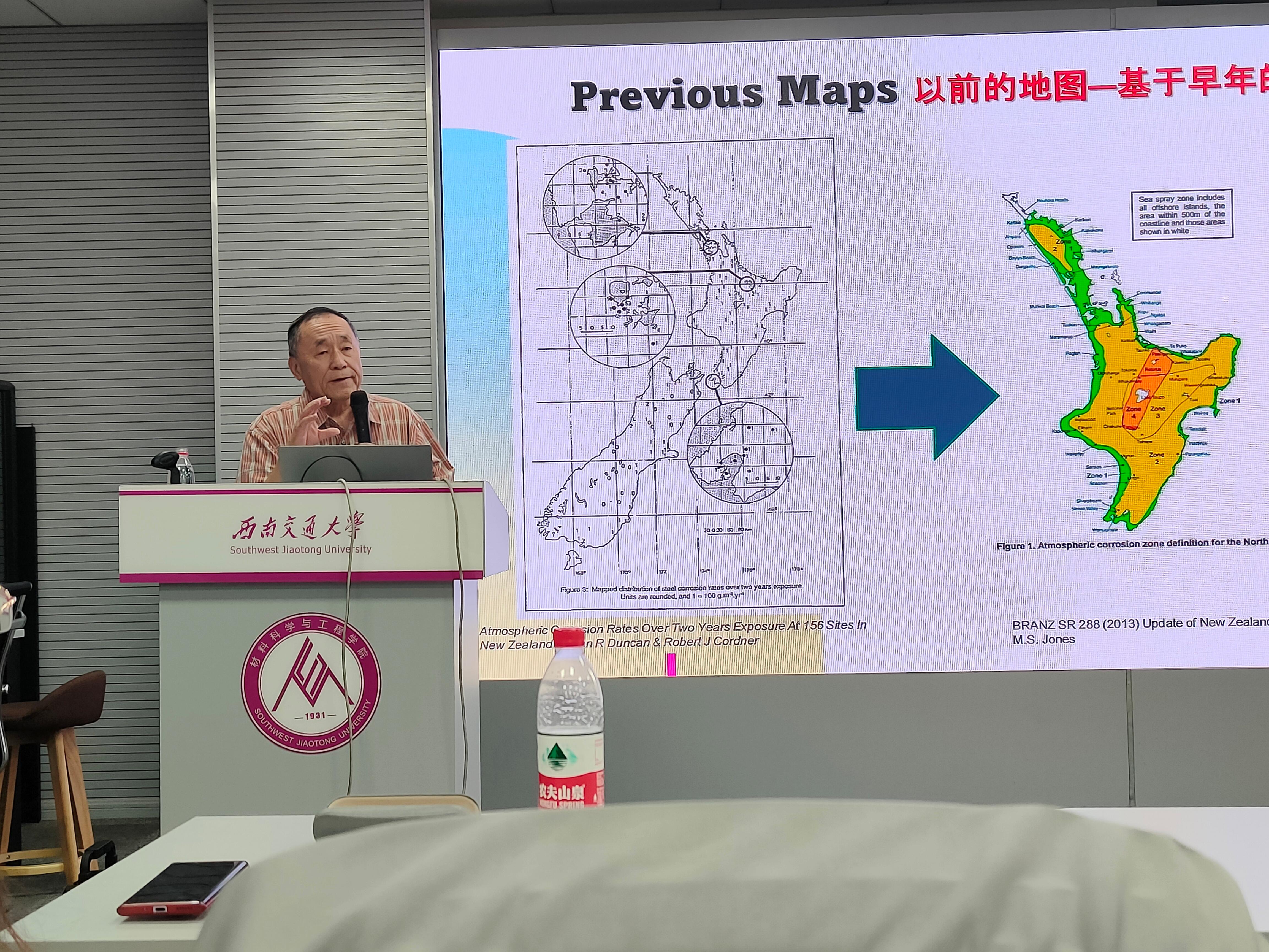 高唯院士首先分享了自己的学术生涯,从博士、博士后的课题研究到工作后从事的研究方向。然后重点讲述了腐蚀的产生机理及防止措施,高唯院士在报告中指出腐蚀是材料重要的失效形式,会带来巨大的经济损失,腐蚀的机理非常复杂,环境、材料的诸多因素交互影响使腐蚀预测非常困难。对于如何降低腐蚀造成的危害,高唯院士提出通过计算化学和机器学习,基于大量的天气信息和腐蚀测试大数据的方法,揭示腐蚀反应的机理,主要因素及气候变化对腐蚀的影响,建立了新西兰数字腐蚀图,用于预测和控制腐蚀危害。