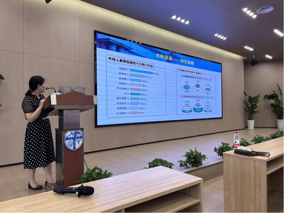 黄春蓉结合当前大学生就业中普遍存在的问题,鼓励大家减少精神内耗,克服盲从、焦虑心理,尽早积极行动起来,并预祝在即将到来的秋招中斩获心仪的工作岗位。