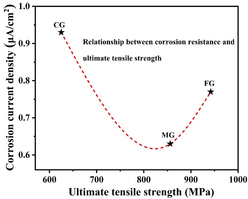 亚稳态高熵合金由于优异的机械性能而具有广阔的应用前景。通常,除了良好的强-塑结合外,耐腐蚀性也是作为先进结构材料需要评估的重要指标。但目前对这些亚稳态高熵合金的研究主要集中在机械性能上,对其腐蚀行为的研究不足。由于晶界具有高电化学活性和晶体缺陷,材料的腐蚀行为受到晶粒尺寸的影响,并且以往的研究还证实晶粒细化对材料腐蚀行为的影响存在一定的争议。此外,与晶粒尺寸对腐蚀行为影响相对应的机械性能变化可能并不是单调的,这意味着耐腐蚀性和机械性能之间可能存在某种权衡。因此,研究不同晶粒尺寸对亚稳态高熵合金腐蚀行为和机械性能的协同效应至关重要,因为对它们的基本了解将有助于进一步阐明晶粒尺寸对腐蚀行为影响的机制,并开发可承受恶劣环境的亚稳态高熵合金。