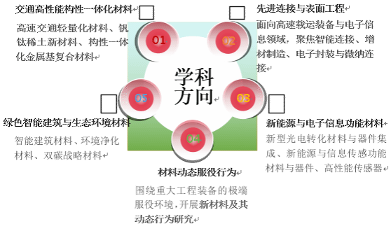 1. 学科整体实力强,轨道交通特色突出。西南交通大学是我国轨道交通人才培养与科学研究发源地,材料学科聚焦于国家“交通强国”重大战略,致力于轨道交通材料国产化升级创新,形成了轨道交通材料设计理论与方法、先进成型制备、先进焊接与连接、全生命周期服役安全可靠性评价的理论、技术研究体系,全面支撑了国家轨道交通材料自主自强,引领了未来轨道交通发展方向,建设形成了以轨道交通材料为特色的人才培养和科技创新基地。ESI学科排名稳步提升,晋位到全球第191位(截止2023年11月),居全球前1.43‰。
