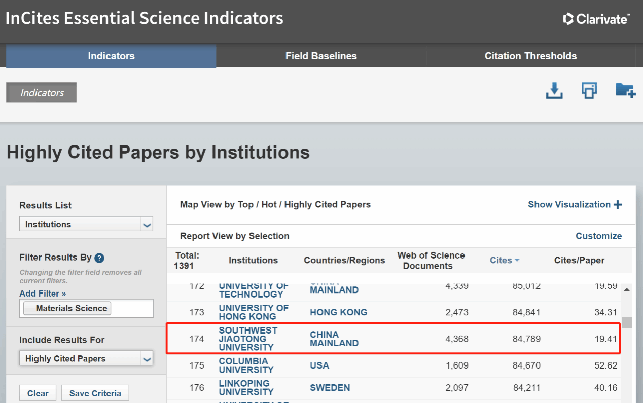2024年5月西南交大ESI材料科学全球排名