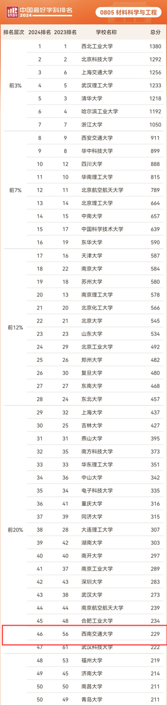 大发体育 材料科学与工程学科位于榜单前20%,相较于去年,排名上升10个位次,排名提升4%,位列全国46,呈现稳步上升态势。
