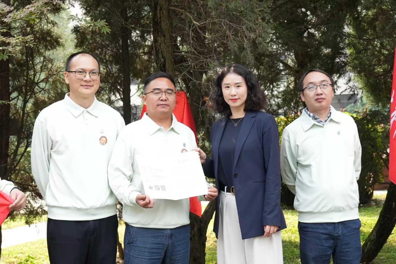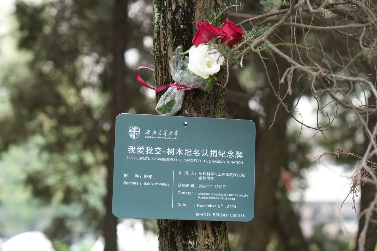 11:30,校友们来到茅以升图书馆前,举行“我爱我交——树木冠名认捐”活动。校友办副主任彭燕出席活动,欢迎材料2000级校友返校,感谢参加认捐活动。随后彭燕副主任和三个班的代表共同揭牌,并送上认捐证书。