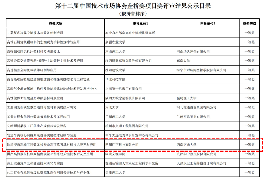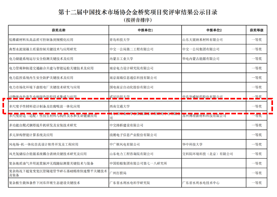 陈辉教授牵头,联合四川广正科技有限公司申报的“轨道交通高端工程装备长寿命高可靠刀具材料技术开发与应用”和孟凡彬教授牵头的“多尺度手性材料设计制备与防腐吸波一体化应用”项目均荣获第十二届中国技术市场金桥奖一等奖。