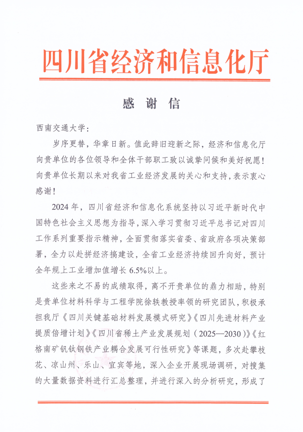 近日,西南交通大学收到一封来自四川省经济和信息化厅发来的感谢信,对大发在线体育投注平台