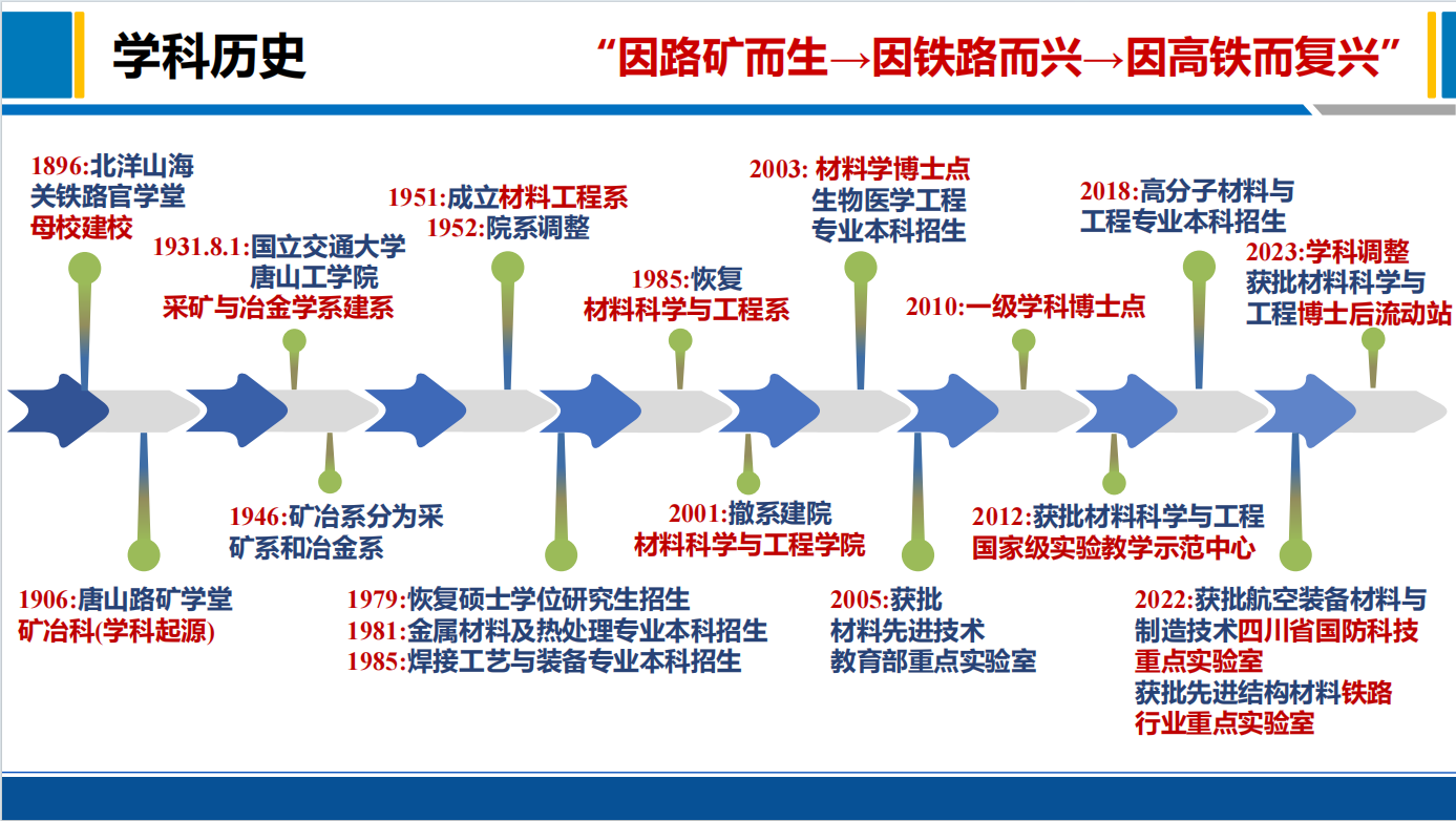 西南交通大学材料学科的历史可追溯至1905年,其前身为中国最早的矿冶工程教育体系之一,培养了包括3位“两弹一星”功勋奖章获得者和16位院士在内的顶尖人才。材料学科聚焦于国家“交通强国”重大战略,围绕高铁、磁浮、川藏铁路等国家重大工程需求,构建了覆盖材料设计、制备、服役评价的全链条研究体系,形成了从轨道交通材料设计理论与方法、先进成型制备、绿色智能加工、全生命周期服役安全可靠性评价的理论、技术研究体系,全面支撑了国家轨道交通材料自主自强,引领了未来轨道交通发展方向。