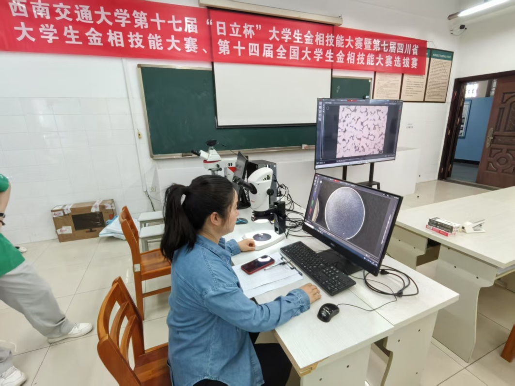 和创新创业学院(工程训练中心)承办,吸引了来自不同学院169名交大学子参与。同时,成都师范学院、成都信息工程大学、成都工贸职业技术学院同步在我校完成校赛选拔。西华大学、四川化工职业技术学院等省内高校派出师生来我校观摩学习。作为全国金相技能大赛校内选拔平台,本届赛事严格采用国家级评审标准,从试样磨制、抛光腐蚀到显微组织观察,全程沿用国赛赛制。材料科学与工程国家级实验教学示范中心(西南交通大学)王良辉老师担任大赛总指挥,川内高校资深国赛评委管登高老师(成都理工大学)、刘杰慧老师(成都工业学院)和王海波老师(攀枝花学院)组成镜下评委。资深国赛评委饶丽老师(西华大学)与国赛、省赛现场评委陈佳老师(成都工贸职业技术学院)、周红梅老师(成都工业学院)以及我校创新创业学院李娟、大发在线体育投注平台