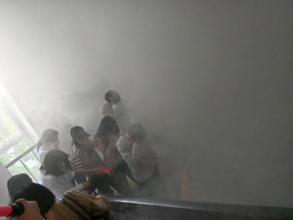 培训后进行疏散演练,浓烟警报中,师生用消防逃生湿毛巾捂住口鼻,迅速疏散至逸夫馆旁空地。在保卫处组织下,师生运用所学,逐一实操灭火。