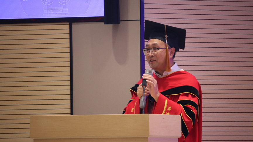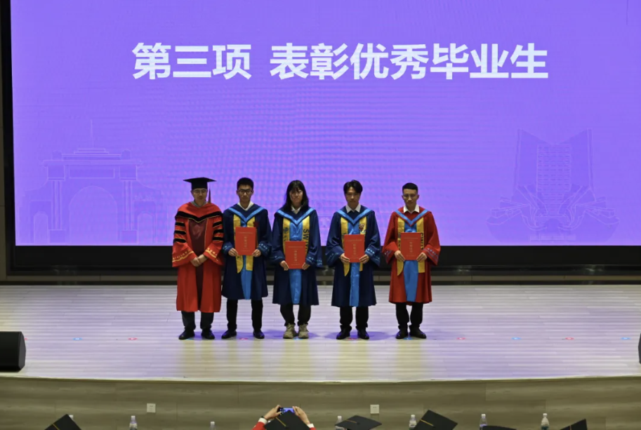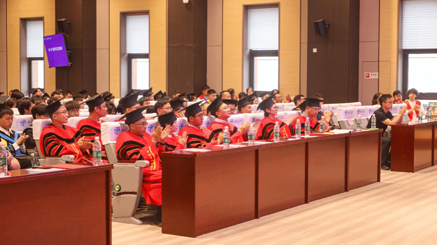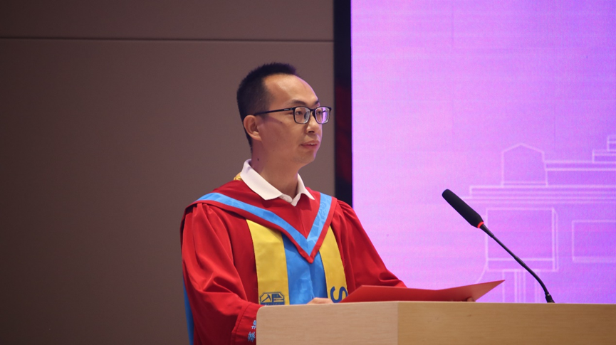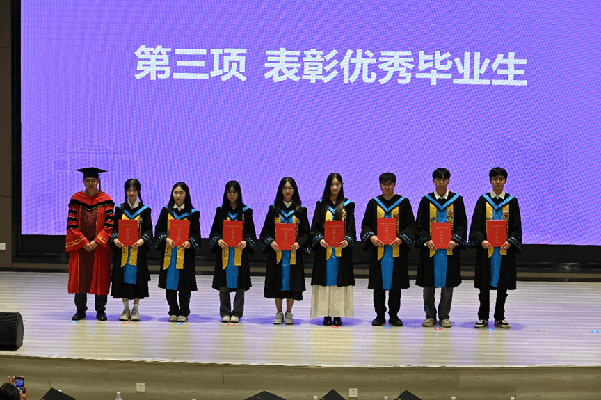 游戏过后,毕业典礼进行到第八项议程,陈辉为毕业生们送上了诚挚的祝福,他带着毕业生们回忆了四年来在学院的学习生活,并向材子们送出四个字:一是“变”,要主动拥抱变化,“以变应变”,以开放心态迎接从“学习者”到“贡献者”的身份转型;二是“交”,重视交流协作,正视交叉创新,以多样包容的视角面对世界;三是“通”,须锤炼处世格局,通情达理,以包容胸襟化解挑战;四是“道”,不忘初心,将学术探索力转化为目标导向的攻坚力,在规则中创新突破。陈辉院长饱含深情与期待的四字箴言,收获了满堂学生持久热烈的掌声。