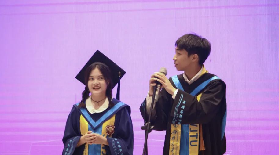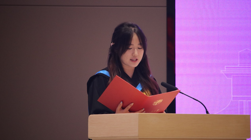 毕业会进行到第五项议程,本科生毕业代表任佳琪与研究生毕业代表刘英宗相继发言,深情致敬母校培育。