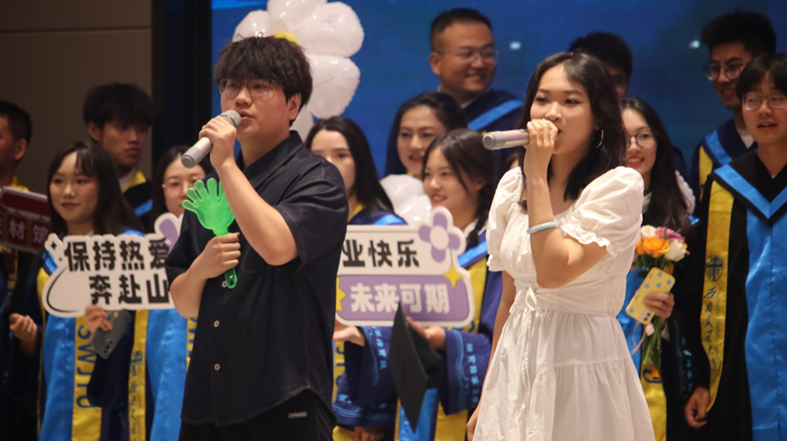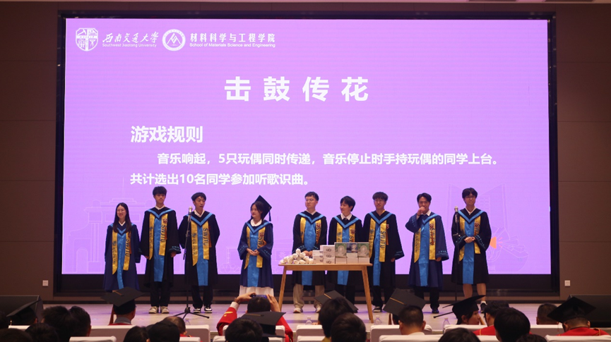 仪式结束后,来到了开心有趣的互动游戏环节,同学们击鼓传花,选取了幸运的三十位同学,材子和老师们共同进行“师生同心”游戏。“材料科学基础”“磨金相”“竢实扬华”“材料青年视界”等在大学生涯中高频出现的词汇在大屏幕上出现,老师们妙语连珠地描述,台上同学们争先恐后地抢答。每一次默契的破解都引来阵阵欢呼,每一个精彩瞬间都交织着欢笑与掌声,共同定格为毕业日难忘的珍贵一瞬。