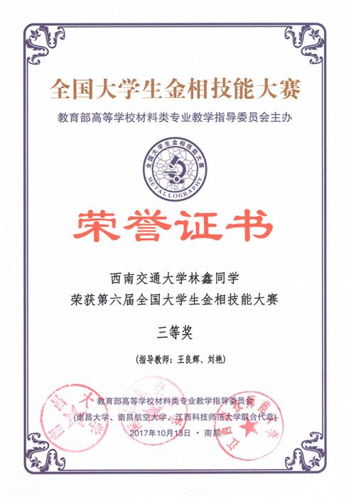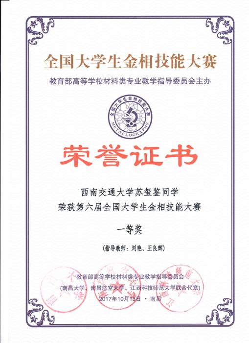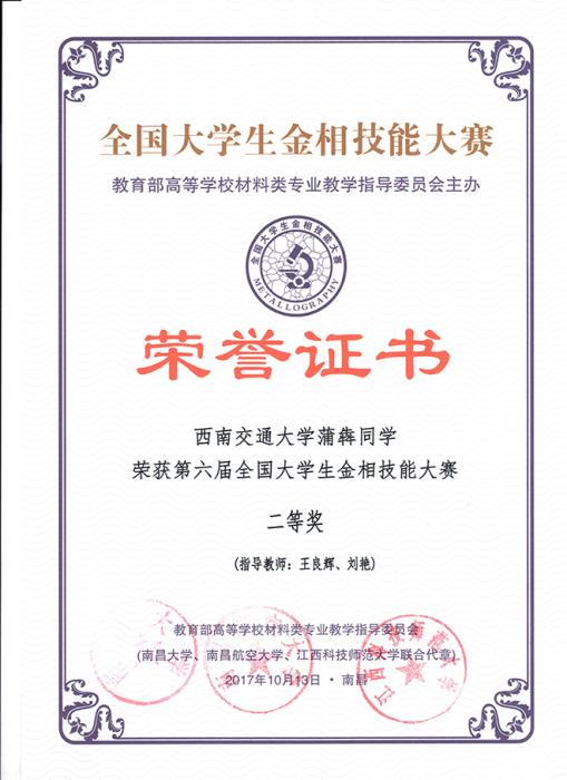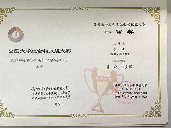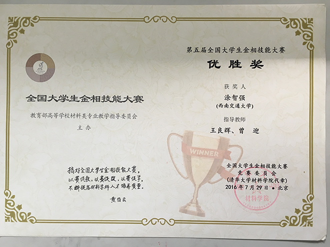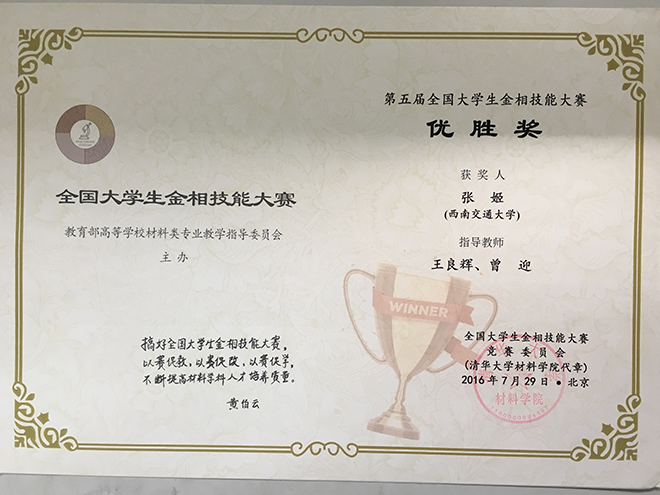 获得一等奖一人,二等奖一人,三等奖一人,综合技能大赛参赛选手获得三等奖;2017年南京理工大学举办的第五届金相大赛中大发体育