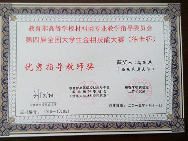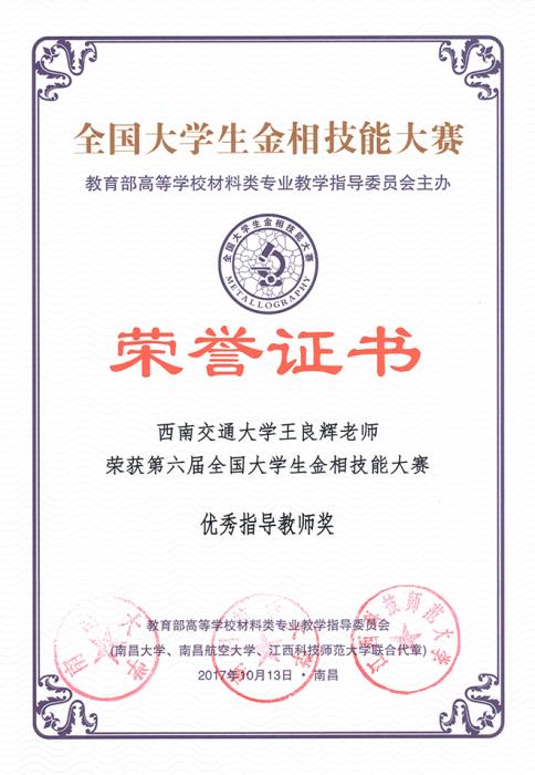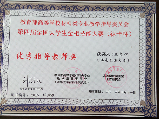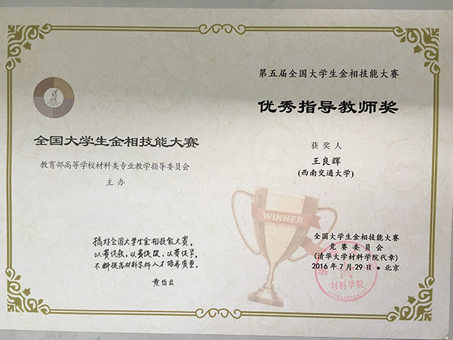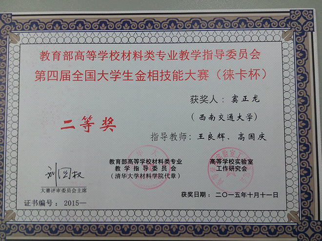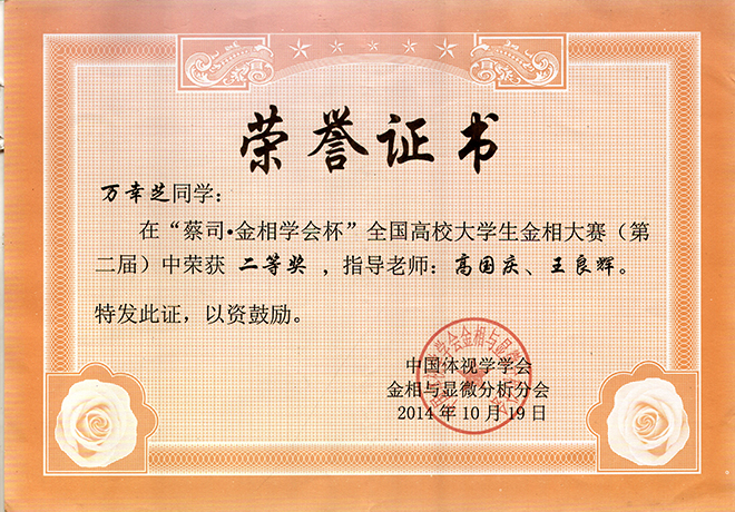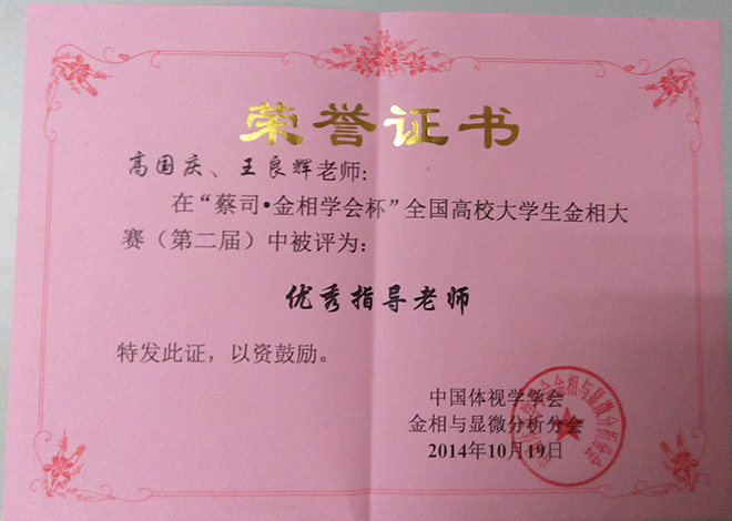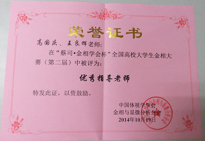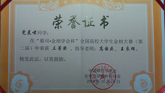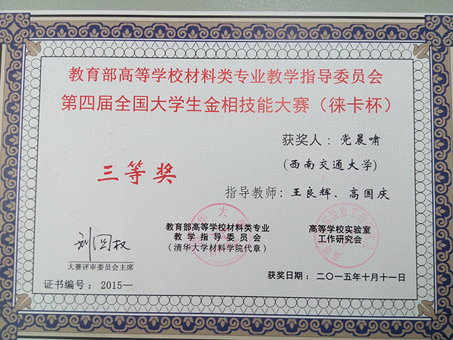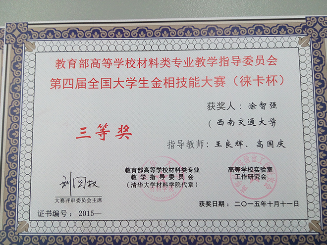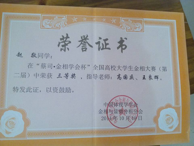 参加了近三年由教育部高等学校材料类专业教学指导委员会(简称教指委)主办的“徕卡杯”全国大学生金相技能大赛,共获得一等奖2人,二等奖2人,三等奖三人,优胜奖2人。