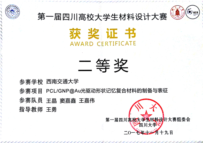 王勇教授指导,王晶等同学完成的《PCL/GNP@Au光驱动形状记忆复合材料的制备与表征》获得二等奖。