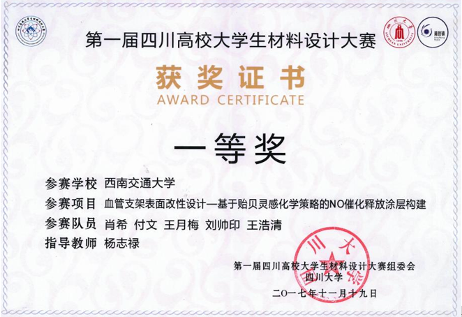 杨志禄老师指导的团队完成的《血管支架表面改性设计——基于贻贝灵感化学策略的NO催化释放涂层构建》获得一等奖。