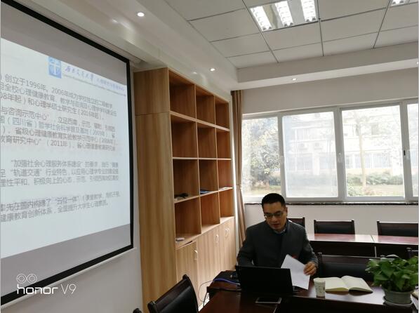 与心理研究与咨询中心共同举办“全面提升大学生心理素质,构建心理健康教育创新体系”学习交流会在X2128举行。参加本次会议人员有西南交通大学心理研究与咨询中心副主任雷鸣老师,大发在线体育投注平台